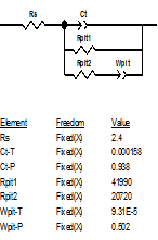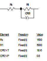 實(shí)際上,當(dāng)p=1時(shí),如果令T=C,則有Z=1/(jωC),此時(shí)CPE相當(dāng)于一個(gè)純電容,波特圖上為一個(gè)在第一象限的半圓,相應(yīng)電流的相位超過電位正好90度,當(dāng)p=-1時(shí),如果令T=1/L,則有Z=jωL,此時(shí)CPE相當(dāng)于一個(gè)純電感,波特圖上為一在第四象限的正半圓,相應(yīng)電流的相位落后電位正好90度;當(dāng)p=0時(shí),如果令T=1/R,則Z=R,此時(shí)CPE完全是一個(gè)電阻。
