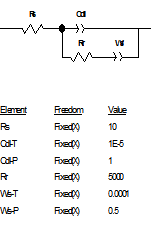 可以證明,彌散角φ=π/2*(1-CPE-P),特別有意義的是,當(dāng)CPE-P=0.5時(shí),CPE可以用來取代有限擴(kuò)散層的Warburg元件。 Warburg元件是用來描述電荷通過擴(kuò)散穿過某一阻擋層時(shí)的電極行為。在極低頻率下,帶電荷的離子可以擴(kuò)散到很深的位置,甚至穿透擴(kuò)散層,產(chǎn)生一個(gè)有限厚度的Warburg元件。如果擴(kuò)散層足夠厚或者足夠致密,將導(dǎo)致即使在極限低的頻率下,離子也無法穿透,從而形成無限厚度的Warburg元件,而CPE正好可以模擬無限厚度的Warburg元件的高頻部分。當(dāng)CPE-P=0.5時(shí),