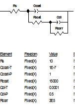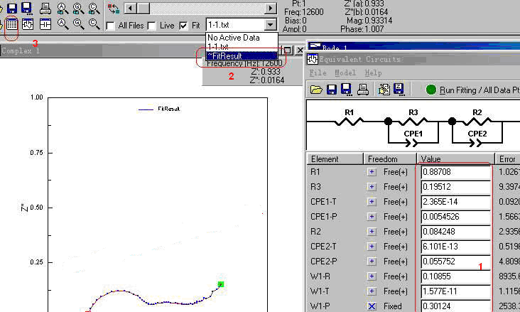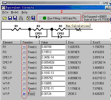 1.7把圖1-9中的“1”處的Fixed改成Free,為擬合作準(zhǔn)備,同時(shí)需要將等效電路擬合窗口(如圖1-10)中的mode由“Simulation 改選為“Fitting”才能擬合。