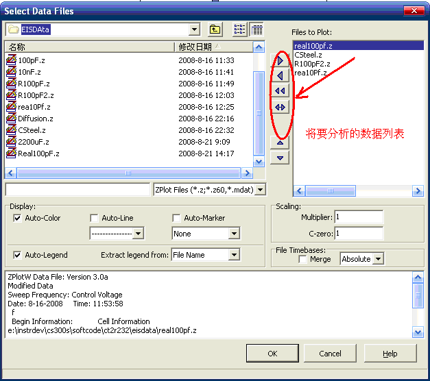 1.1 打開數(shù)據(jù)文件,從菜單“File”-“Data File”將阻抗數(shù)據(jù)文件通過箭頭導(dǎo)入到右邊列表中,如下圖3。