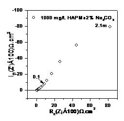 以上所講的等效電路僅僅為基本電路,實(shí)際上,由于電極表面的彌散效應(yīng)的存在,所測得的雙電層電容不是一個(gè)常數(shù),而是隨交流信號的頻率和幅值而發(fā)生改變的。一般來講,彌散效應(yīng)主要與電極表面電流分布有關(guān)。在腐蝕電位附近,電極表面上陰、陽極電流并存,當(dāng)介質(zhì)中存在緩蝕劑時(shí),電極表面就會為緩蝕劑層所覆蓋,此時(shí),鐵離子只能在局部區(qū)域穿透緩蝕劑層形成陽極電流,這樣就導(dǎo)致電流分布極度不均勻,彌散效應(yīng)系數(shù)較低。表現(xiàn)為容抗弧變“癟”,如圖3所示。另外電極表面的粗糙度也能影響彌散效應(yīng)系數(shù)變化,一般電極表面越粗糙,彌散效應(yīng)系數(shù)越低。